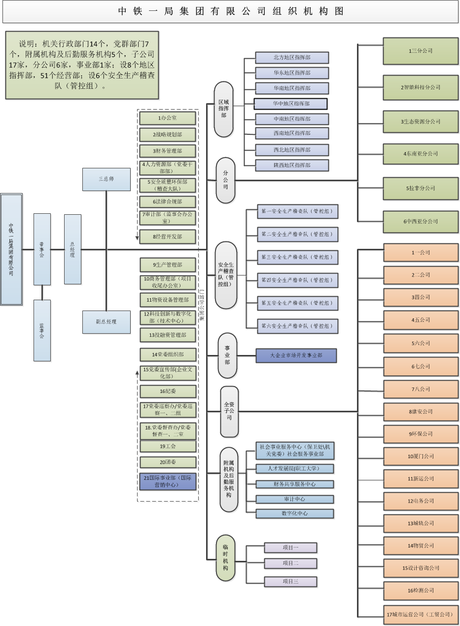 集團(tuán)公司機(jī)關(guān)本部共設(shè)置21個(gè)部門,其中行政部門14個(gè),黨群部門7個(gè)(黨委巡察辦、黨委督查辦為一套管理人員,履行相應(yīng)職責(zé))。行政部門具體為辦公室(黨委辦公室、董事會(huì)辦公室、保密委員會(huì)辦公室)、戰(zhàn)略規(guī)劃部、財(cái)務(wù)管理部、人力資源部(黨委干部部)、安全質(zhì)量環(huán)保部(稽查大隊(duì))、法律合規(guī)部、審計(jì)部(監(jiān)事會(huì)辦公室)、經(jīng)營開發(fā)部、生產(chǎn)管理部、商務(wù)管理部(項(xiàng)目收尾辦公室)、科技創(chuàng)新與數(shù)字化部、物資設(shè)備管理部、投融資管理部、國際事業(yè)部(國際營銷中心);黨群部門具體為黨委組織部、黨委宣傳部(企業(yè)文化部)、紀(jì)委、黨委巡察辦、黨委督查辦、工會(huì)、團(tuán)委。集團(tuán)公司下設(shè)8個(gè)地區(qū)指揮部,51個(gè)經(jīng)營部,負(fù)責(zé)經(jīng)營開發(fā)工作;設(shè)6個(gè)安全生產(chǎn)稽查隊(duì)(管控組)負(fù)責(zé)安全監(jiān)管工作。集團(tuán)公司下設(shè)17家子公司、6家分公司、1家事業(yè)部。具體信息附圖