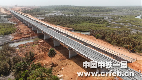 中鐵一局MXTJ-01標鋪架工程承接標段內T梁預制及架設1710孔、正線鋪軌289.14公里、站線鋪軌61.06公里的施工任務,馬瑞巴亞港至穆薩亞站區間線路全長55公里。自今年2月19日,跨幾內亞鐵路MXTJ-01標正式進入長軌鋪設階段以來,項目部克服交叉施工組織復雜、長軌運輸安全風險高、語言溝通障礙、高溫酷暑等諸多困難和挑戰,圍繞大干130天勞動競賽活動節點目標,深入開展“決勝鋪軌保開通”勞動競賽,中幾雙方攜手合作,科學規劃、高效組織,采用長鋼軌牽引車進行機械化長軌鋪設,以平均單班鋪設5.4公里的進度連續奮戰34天,順利完成馬瑞巴亞港至穆薩亞站區間長軌鋪設任務。