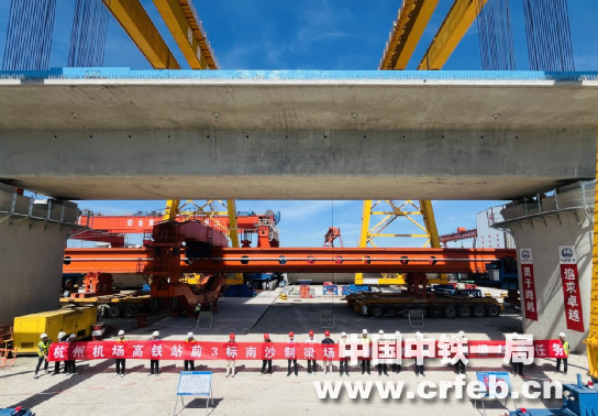 杭州機場高鐵起自桐鄉站,終于紹興北站,長72.6公里,沿途設海寧觀潮站、錢塘站、蕭山機場站,其中,桐鄉站至錢塘站設計時速350公里,錢塘站至紹興北站設計時速250公里。此次架設的首孔箱梁位于江東特大橋,大橋全長6.617公里,共有7處連續梁,需完成174孔箱梁的預制及架設任務。