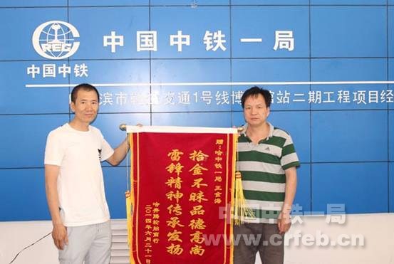 21日下午,錢包失主將一面秀著“拾金不昧品德高尚,雷鋒精神傳承發(fā)揚(yáng)”的錦旗送到王金海所在項(xiàng)目部,以此贊揚(yáng)中鐵一局員工的高尚品德。
