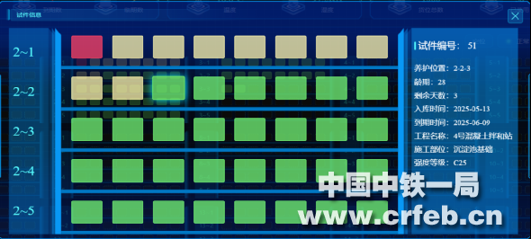 試件檢測、智能預警。為了提升試驗檢測工作效率,確保工程實體質(zhì)量,項目部推廣應用標養(yǎng)室智能預警系統(tǒng)。該系統(tǒng)不只是簡單的溫濕度數(shù)據(jù),還包括試件對應的施工部位、存放位置、養(yǎng)護齡期等完整信息。當試件達到檢測齡期時,系統(tǒng)會通過顏色變化和語音播報進行雙重提醒。這套智能養(yǎng)護系統(tǒng)降低了試件養(yǎng)護過程中的人為失誤風險,為工程質(zhì)量控制提供了有力保障。