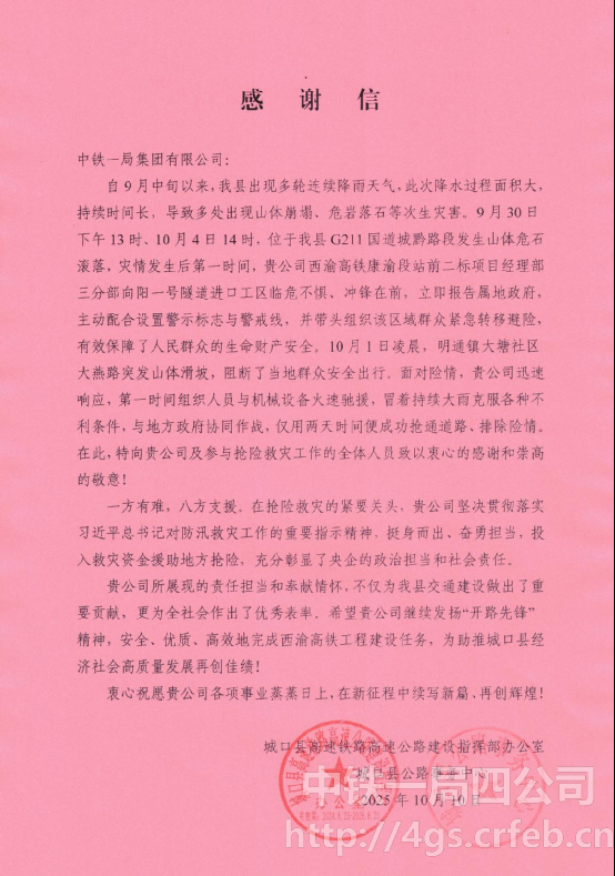 近日,中鐵一局四公司收到來自城口縣高速鐵路高速公路建設指揮部辦公室、城口縣公路事務中心的表揚信,信中對公司在地方交通搶險救援中的積極作為與突出貢獻予以充分肯定。