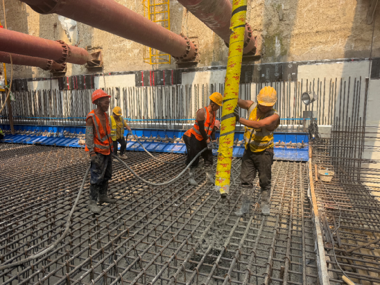 為確保優(yōu)質(zhì)高效完成本次澆筑任務(wù),建設(shè)團(tuán)隊(duì)高度重視,多措并舉,一是嚴(yán)格遵循“樣板引路、標(biāo)準(zhǔn)先行”的原則,按照規(guī)范要求完成防水施工、鋼筋綁扎、模板安裝等工序,并順利通過首件驗(yàn)收;二是不斷優(yōu)化施工組織,多次召開碰頭會,科學(xué)調(diào)配人、機(jī)、料資源,確保各工作面銜接順暢;三是落實(shí)領(lǐng)導(dǎo)帶班制、旁站制及三檢制等,重點(diǎn)盯控土方開挖運(yùn)輸、鋼支撐架設(shè)等主要工序關(guān)鍵工序、關(guān)鍵環(huán)節(jié),及時(shí)解決現(xiàn)場問題,確保澆筑作業(yè)全過程管控;四是面對汛期施工挑戰(zhàn),建設(shè)團(tuán)隊(duì)執(zhí)行汛期值班制度,24小時(shí)輪班值守的同時(shí),每隔2小時(shí)左右對深基坑邊坡、臨時(shí)排水系統(tǒng)等進(jìn)行巡視巡察,并匯報(bào)巡查情況,確保安全受控。