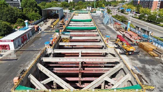 此次完成封底的稱山南路站位于上虞區核心區域,車站全長178米,標準段寬19.7米,開挖深度達16.8米,是全線地質條件最為復雜的站點之一。車站基坑坐落于典型軟土地層,對圍護結構變形控制要求極高。施工過程中,項目團隊應用鋼支撐伺服軸力補償系統,通過巖土工程的“時空效應”理論指導,在土方開挖、支撐架設、基底收底、底板澆筑等關鍵環節爭分奪秒,成功將基坑圍護結構變形量控制在可控范圍內。