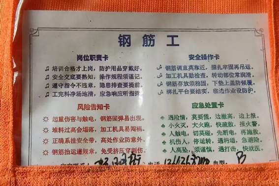 此外,項目物機部還根據現場網格化管理制度設計了袖標,并在馬甲上標識班組信息,通過馬甲和袖標即可區分班組長、網格員、司索等不同類型的班組人員;針對門吊、挖機、吊車等大型設備的操作人員,物機部實行“定人定機”制度,并填寫發放安全“兩單兩卡”放置于馬甲前側醒目位置,確保人員管控到位。