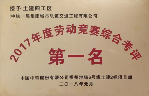 (祝賀福州地鐵6號線土建2標4工區喜獲標段2017年度綜合考評第一名)