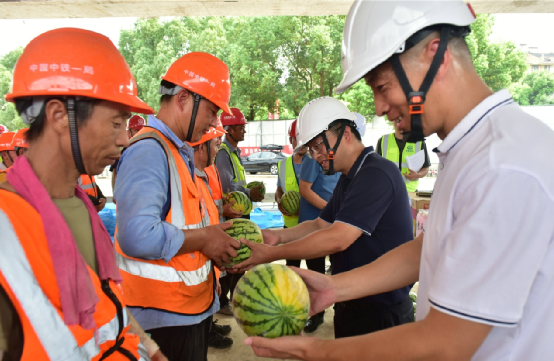 下午許,公司工會主席、總經(jīng)濟師王黨庫,無錫蘭亭四季置業(yè)公司項目負責人許懷洲、江蘇華城工程管理咨詢有限公司監(jiān)理總監(jiān)羅培金等共同為一線工友送去了西瓜、鹽汽水及藿香正氣水等防暑物資和藥品,叮囑大家時刻注意身體健康,做到勞逸結(jié)合,要求項目部眾志成城,克服高溫挑戰(zhàn),質(zhì)量和進度要做到“高溫更高效、炙烤更炙熱”,同時還要以人為本,采取必要的措施和方法,保證職工平安度暑。