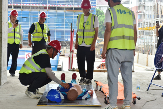 項目工期緊,任務(wù)重,夏季作業(yè)易出現(xiàn)中暑。為此,項目部詳細制定了高溫群體中暑應(yīng)急預(yù)案,并在活動中開展了應(yīng)急演練。演練中,應(yīng)急領(lǐng)導(dǎo)小組迅速組織動員,醫(yī)療救護組、警戒聯(lián)絡(luò)組、后勤保障組各司其職,緊密配合,作業(yè)人員匯報及時,臨時急救得當,贏得業(yè)主及附二院醫(yī)生的認可。徐懷洲在點評中表示,項目部前期策劃周密、演練絲絲入扣、效果良好。他要求項目部要“真演真練”促實操實干,確保夏季施工安全萬無一失。本次演練在檢驗預(yù)案可操作性的同時,為觀摩的工友也上了一堂沉浸式體驗課。