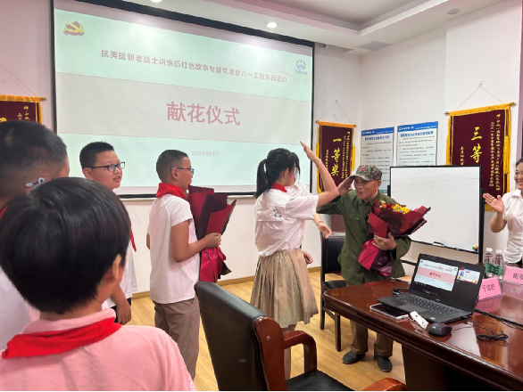 在項目黨支部負(fù)責(zé)同志的主持下,與會的青年和少先隊員有序為于成君老戰(zhàn)士送上了鮮花和祝福。雖然于老已經(jīng)96歲高齡,但依然以他鏗鏘有力四川口音,為全體人員講述了他此生最引以為傲的回憶。