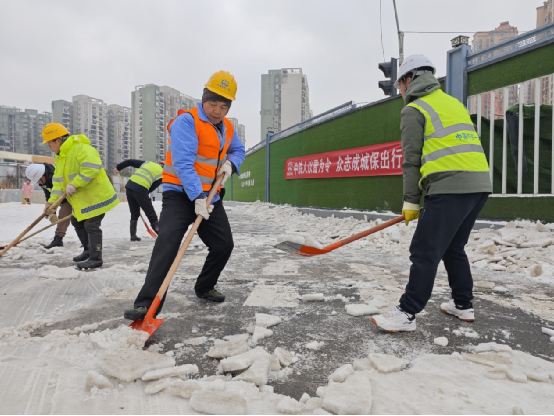 中鐵一局無錫地鐵5號線8標項目多名黨員、團員志愿者及現場作業人員積極反應、快速行動,在施工站點內部鋪設鋪設防滑墊;手持鐵鍬、掃帚,攜帶工業鹽等工具破除施工現場周圍道路上的冰障,使路面恢復整潔暢通。