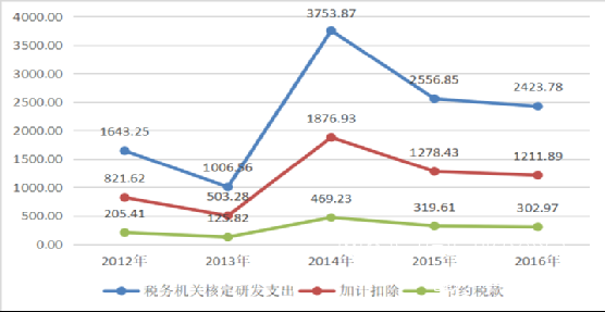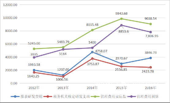 以我公司數(shù)據(jù)為例,2012年我公司報表反映研發(fā)支出1993.58萬元,實(shí)際匯算清繳時稅務(wù)機(jī)關(guān)核定研發(fā)支出1643.25萬元,二者相差350.33萬元;2013年相差230.49萬元,2014年相差1004.20萬元,2015年相差413.82萬元,2016年相差1422萬元。假設(shè)報表研發(fā)費(fèi)用與稅務(wù)機(jī)關(guān)核定研發(fā)支出的差額為研發(fā)費(fèi)用的無效金額,從圖中可以看出,公司五年來的研發(fā)費(fèi)用都存在著無效金額。它的存在無形中擠占了公司的管理費(fèi)用,是造成公司管理費(fèi)用過大或管理費(fèi)用率超的重要原因。而公司研究開發(fā)費(fèi)的使用必須遵循集團(tuán)公司《研發(fā)費(fèi)用管理辦法》規(guī)定,各單位投入研發(fā)費(fèi)用的比例原則上不得低于上年?duì)I業(yè)收入的1.8%。這就需要我們在管理費(fèi)用率受控的前提下,盡可能的按稅收政策的要求,明確研發(fā)費(fèi)用歸集的范圍,加強(qiáng)研發(fā)費(fèi)用管理,更合理合規(guī)的歸集研發(fā)費(fèi)用,從而消除研發(fā)費(fèi)用的無效金額。這樣,才能既讓公司的管理費(fèi)用率達(dá)標(biāo),也充分實(shí)現(xiàn)研發(fā)支出的加計扣除。