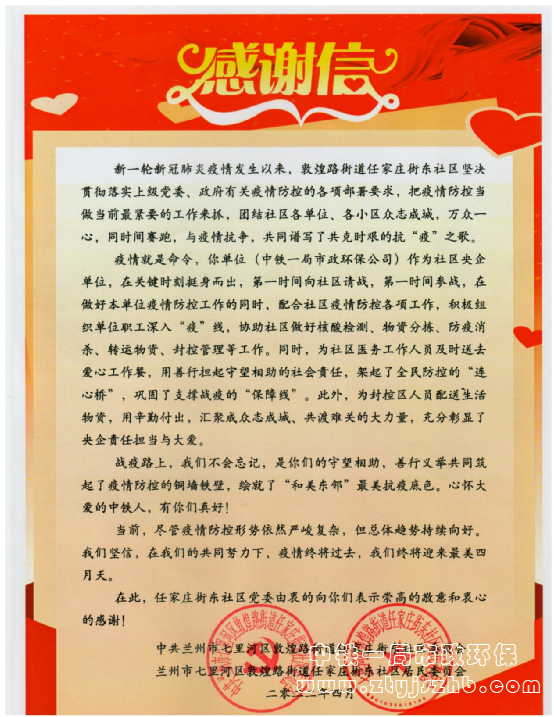 4月17日下午,蘭州市七里河區(qū)敦煌路街道任家莊街東社區(qū)工作人員給公司送來感謝信。信中對新一輪新冠肺炎疫情期間公司積極參加社區(qū)疫情防控工作,與社區(qū)群眾守望相助表示感謝。信中稱:公司積極組織職工深入“疫”線,協(xié)助社區(qū)做好核酸檢測、物資分揀、防疫消殺、轉(zhuǎn)運物資、封控管理等工作,充分彰顯了央企責(zé)任擔當與大愛。任務(wù)終有成,情誼永不斷,社區(qū)工作人員表示:希望公司能夠一如既往地關(guān)心和支持社區(qū)的全面發(fā)展,密切溝通交流。