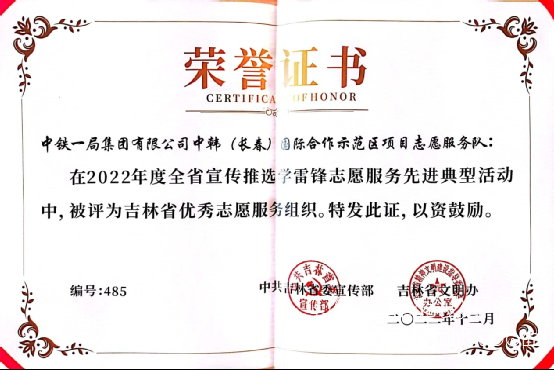 公司中韓(長春)國際合作示范區(qū)項目志愿服務(wù)隊榮獲“吉林省優(yōu)秀志愿服務(wù)組織” 榮譽稱號
