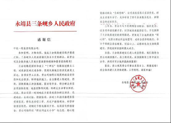 近日,蘭合鐵路項目部收到永靖縣三條峴鄉(xiāng)人民政府發(fā)來的感謝信,以及一面由所在地紅峴子村村委會贈送的“為民排憂解難 彰顯企業(yè)擔當”錦旗,感謝項目部主動擔責,既護住了鄉(xiāng)親們的安居夢,也保障了工程進度。