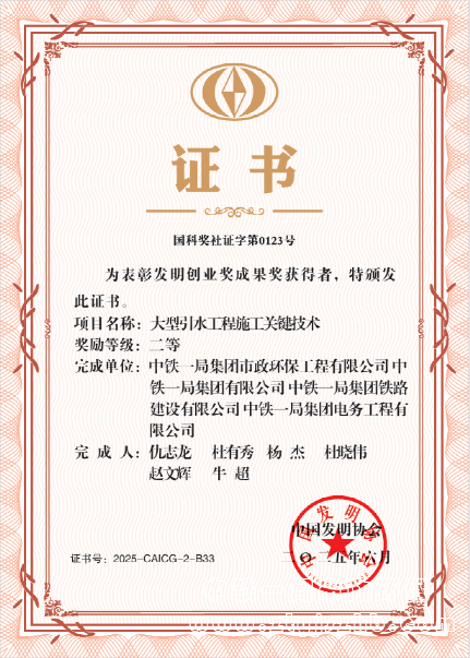 近日,中國發明協會發布了2025年度發明創業獎人物獎、成果獎、創新獎的評審結果,環保公司主持完成的《大型引水工程施工關鍵技術》科研成果榮獲中國發明協會發明創業獎成果獎二等獎。