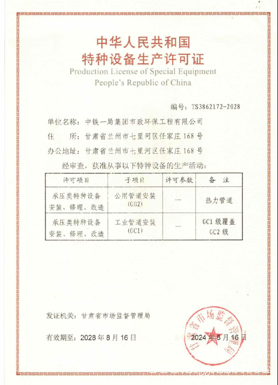 中國中鐵唯一!市政環保公司成功取得所有特種設備壓力管道安裝許可
