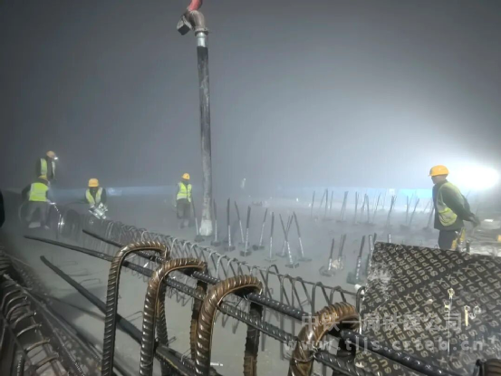 作為許昌市繞城高速公路重難點控制性工程,此次施工的轉體橋需上跨被譽為中國鐵路南北大動脈的京廣鐵路干線。施工期間,不僅必須確保京廣鐵路這一繁忙干線的運輸安全絕對不受影響、時刻保持暢通,還要保證轉體橋梁結構的最終就位精度與內在質量萬無一失,其技術難度與安全標準要求均極高。自9月9日啟動首次澆筑以來,項目團隊直面技術復雜、安全風險高的挑戰,歷經48個晝夜的連續攻堅。通過科學規劃與精細管控各環節,將整個澆筑過程劃分為10個階段有序推進,確保了工程質量和進度處于受控狀態。