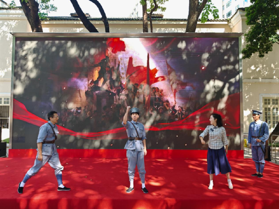 該劇以“紅布帶”為紐帶,將展館實景轉化為起義現(xiàn)場,黨員們化身革命群眾的一員,手持道具,與張?zhí)住⒘汗鹑A等革命先烈一起“參加”廣州起義,在槍炮聲與《國際歌》的激昂旋律中,真切觸摸到一大批革命先烈“為蘇維埃政權奮斗到底”的赤誠初心。當紅布帶系上脖頸的瞬間,歷史不再是書本上的文字,而是化作血脈中的溫度,讓黨員在身臨其境中深化對黨的百年奮斗歷程的理解,筑牢信仰之基。