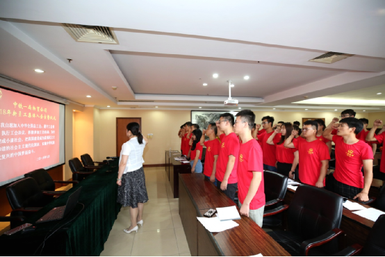 7月11日,公司34名新入職員工穿著紅色的體恤衫,在工會組織下舉行了集體入會儀式。大家面對工會會徽,隨著領誓人的帶領,共同舉起右手莊嚴宣誓,鄭重承諾,使新加盟員工實現“入職”即“入會”。