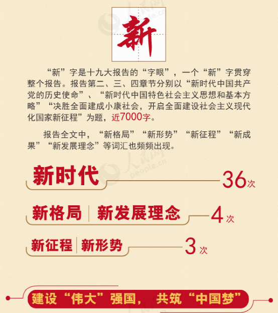 “新”字是十九大報告的“字眼”,一個“新”字貫穿整個報告。報告第二、三、四章節分別以“新時代中國共產黨的歷史使命”、“新時代中國特色社會主義思想和基本方略”“決勝全面建成小康社會,開啟全面建設社會主義現代化國家新征程”為題,近7000字。