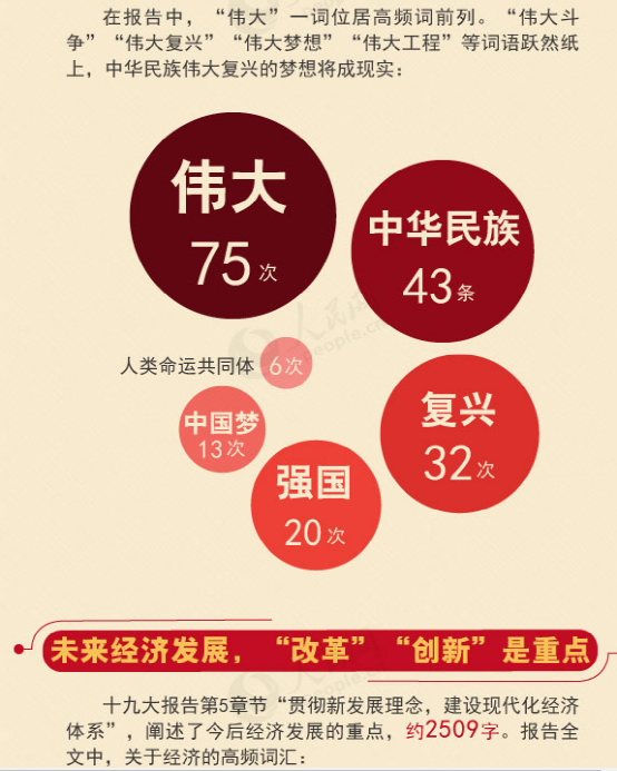 偉大75次,中華民族43條,復興32次,強國20次,中國夢13次,人類命運共同體6次。